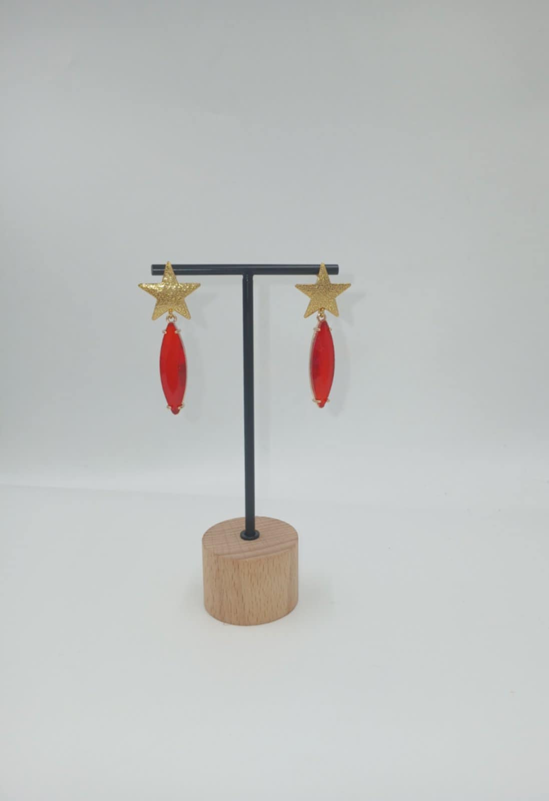 Χειροποίητα σκουλαρίκια, ελληνικής σχεδίασης και κατασκευής από ατσάλι επιχρυσωμένο, σε σχήμα αστεράκι με κόκκινο κρυσταλλάκι. Προσδίδει λάμψη σε κάθε εμφάνιση και συνδυάζεται εύκολα με κάθε ντύσιμο.