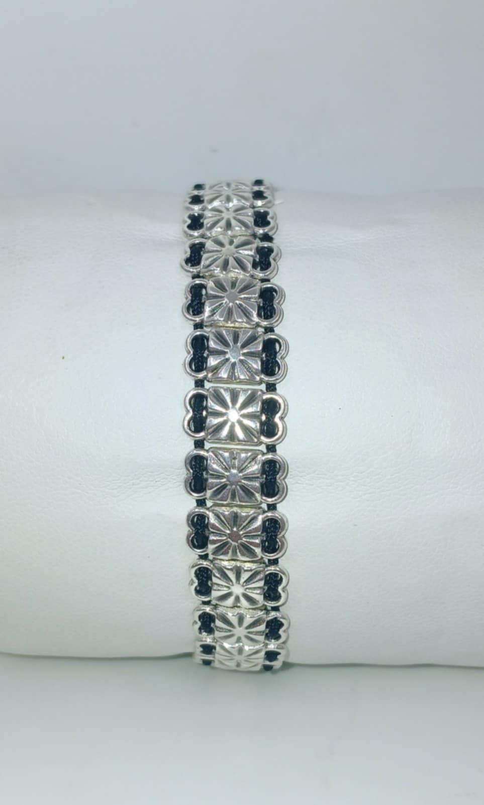 Χειροποίητο βραχιόλι, μακραμέ, ελληνικής σχεδίασης και κατασκευής. Οι ορθογώνιες χάντρες, είναι κατασκευασμένες από ατσάλι επαργυρωμένο. Ιδιαίτερα κομψό, προσδίδει μια διακριτική λάμψη σε κάθε εμφάνιση.